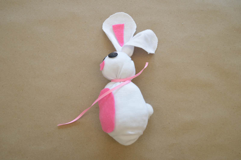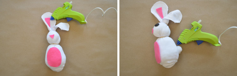 Attach the felt pieces (tummy, nose, and ears) with glue. If you want one of the ears to be floppy, leave one of the ears without a felt piece. Also attach the buttons for eyes (or googly eyes) and the puff ball tail with glue.