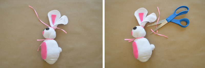 Wrap one piece of ribbon around the bunny’s neck to cover the rubber band, winding it around twice before tying it in a bow.