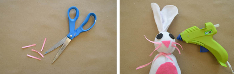 Cut a straight line from the very top of the sock (where there’s no stuffing) to the first rubber band, and be careful not to snip the rubber band. This will split the top into two bunny ears. If you’d like, you can trim the tops of the ears into a rounded shape.