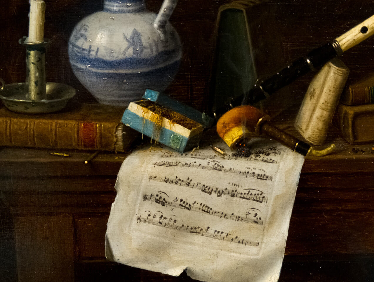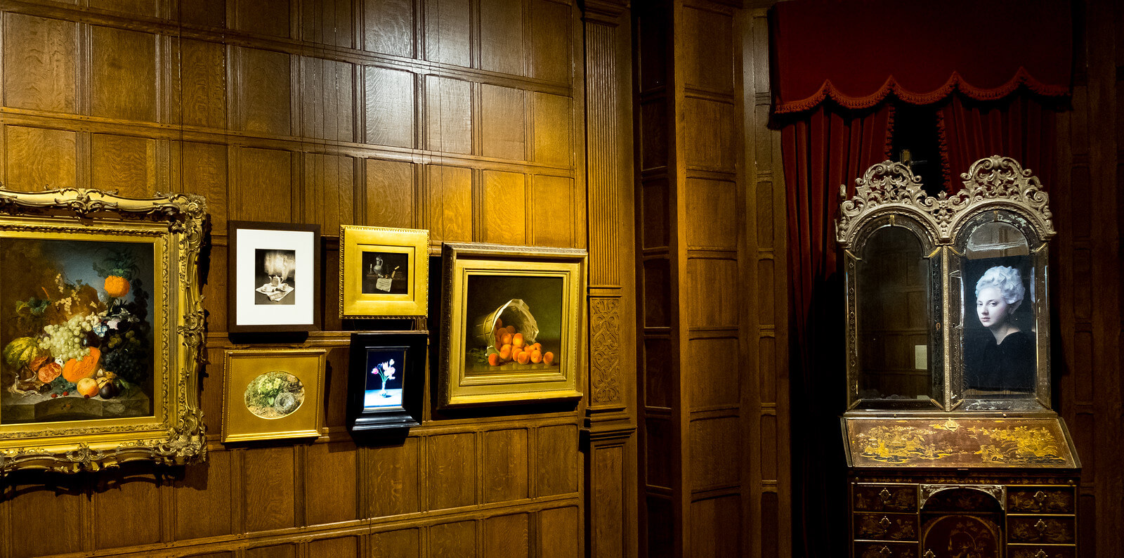 A 2017 Frick aquisition, Hendrik Kerstens' Cream, 2015 (reflected at right), keeps a watchful eye on the still lifes in the Jacobean Room.
