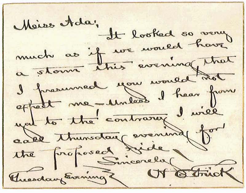 Simple, charming notes from April 1881 from Henry to Adelaide show a quickly growing connection between them. Henry writes, “Miss Ada: It looked so very much as if we would have a storm this evening that I presumed you would not expect me – Unless I hear from you to the contrary I will call Thursday evening for the proposed ride. Sincerely, H.C. Frick.” In another, “Miss Ada: I thank you very much for the beautiful Easter card received from you on Saturday. I prize it very highly. Will you accompany me to see Emma Abbott in ‘Fra Diavolo at Opera House Friday evening 22nd inst? Hoping for a favorable reply I am sincerely H.C. Frick.”