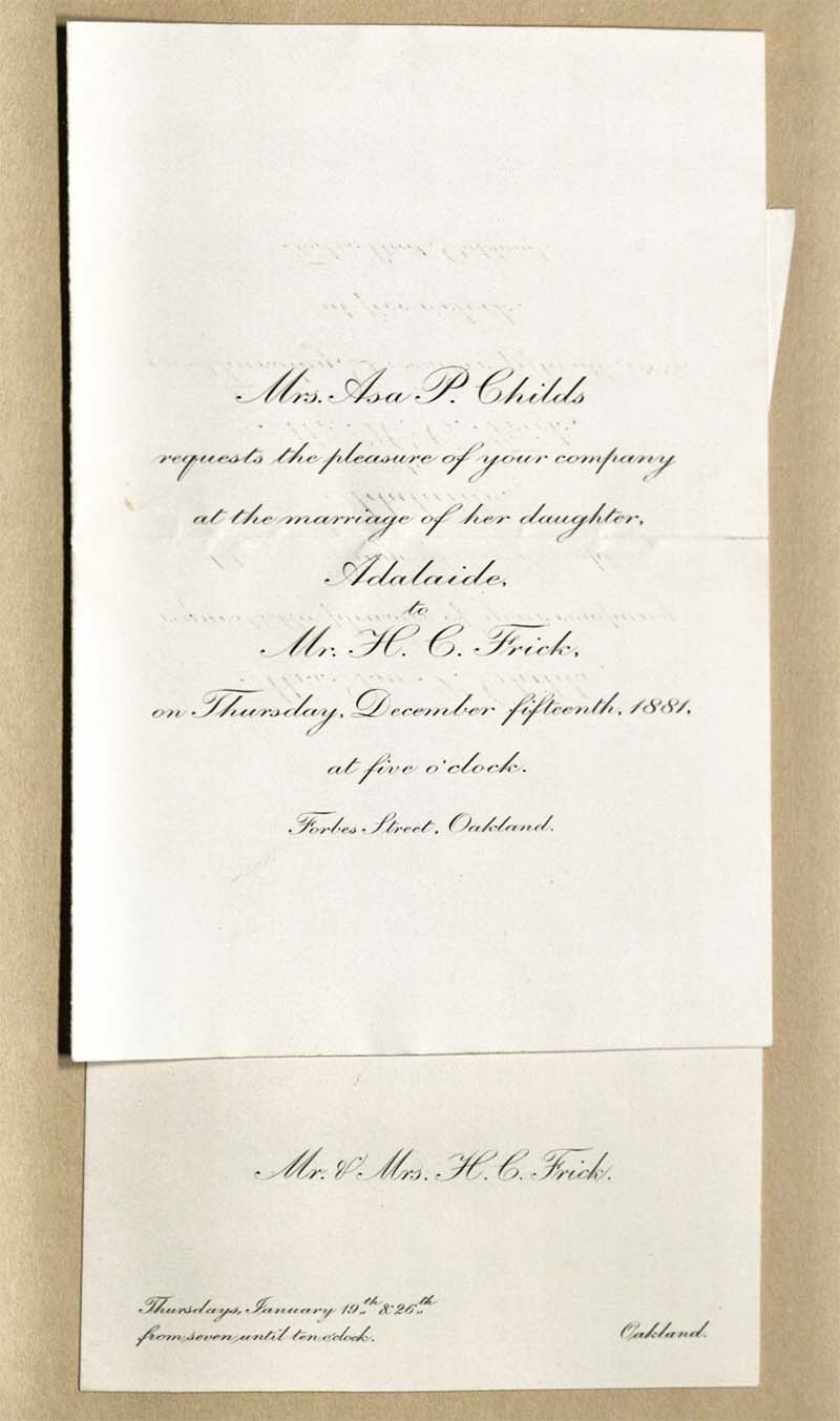 Henry Clay Frick and Adelaide Howard Childs, known respectively as Clay and Ada to friends and family, were acquainted by April 1881. They were possibly introduced at a party by Andrew Mellon, Frick’s good friend and a Pittsburgher who would likely have known Adelaide through social events. (Interestingly, years later Henry and Adelaide assisted in introducing Mellon to his future bride, Nora McMullen, resulting in a much less happy and shorter-lived union than the Fricks’.)