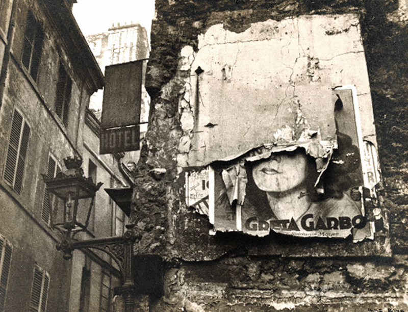 The larger social implications of photography are thoughtfully addressed in Jamie Gruzska’s label, when he asks us to consider along with him the moral implications of photographing sleeping strangers. Is it aggressive? Intrusive? What justification does the photographer have for this surreptitious act? Mark Perrott also asks us to do some thinking, when he considers the idea of “meaningful decay” and the reasons why Ilse Bing might have been interested in photographing the peeling remnants of a Greta Garbo poster.