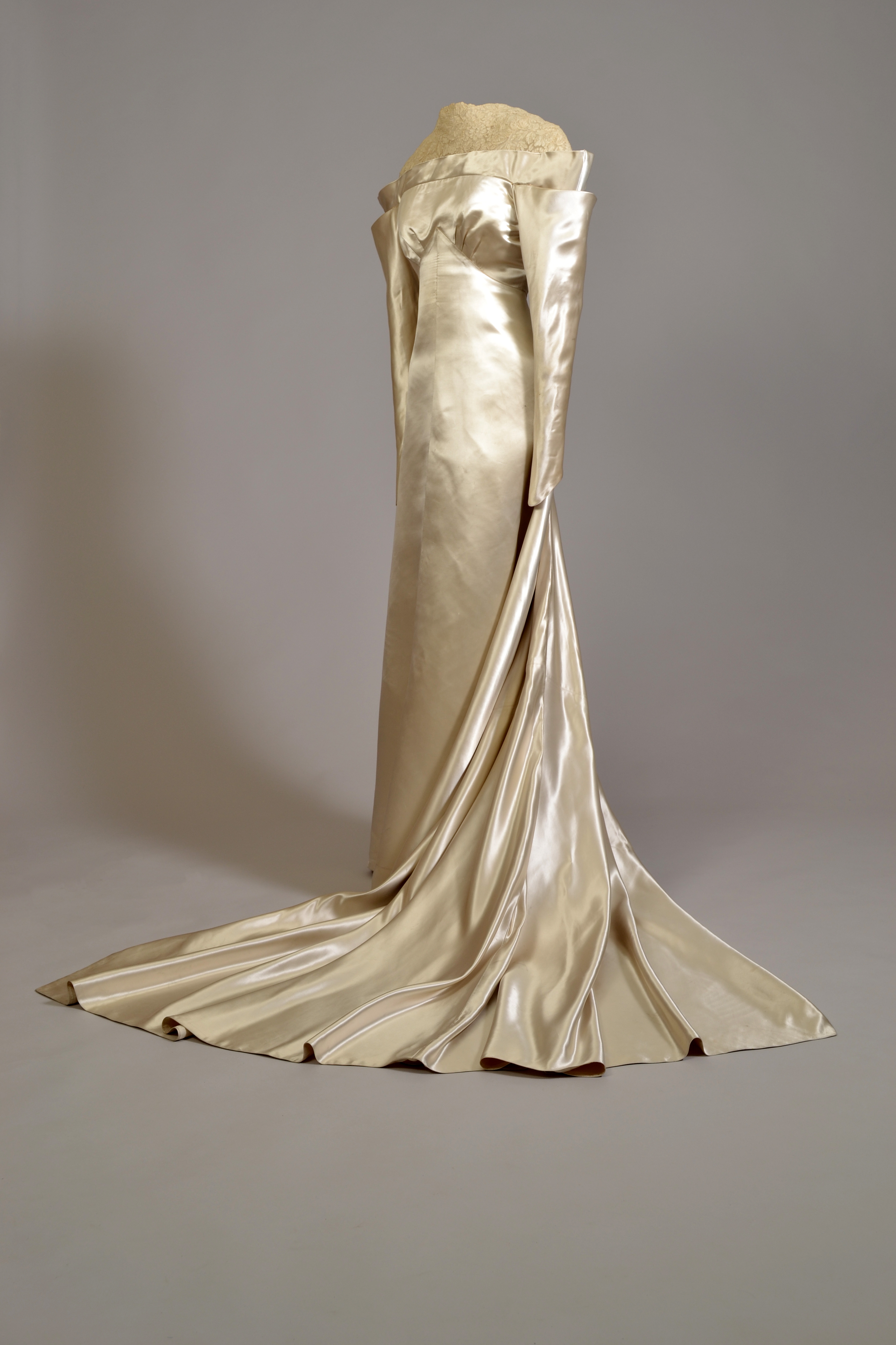 1933’s Christopher Strong has her playing a pilot and adventurer. Although the costuming credit for the film goes to Howard Greer (the designer of the dazzling wedding dress we have in the exhibition, which Hepburn wore for her stage performance of The Lake), the most famous costume in the movie (literally a costume) was designed by Walter Plunkett. His gold lamé moth costume, fitting for Hepburn’s flyer to wear, was heavy and uncomfortable, and even heated up under the hot studio lights (a lining was added to help prevent burns!). It’s truly unforgettable, and I thought it was the best part of the movie. Who can blame Sir Christopher Strong (played by Colin Clive) for staring?Unfortunately, once again Hepburn’s independent, articulate, and accomplished character (who has had no time in her life for romance) has an unhappy ending. An affair with Clive’s character comes to a tragic end. It seems that in 1930s films, the audience is fascinated by the modern characters that Hepburn plays, but uncomfortable with the idea of unconventional choices leading to happiness.