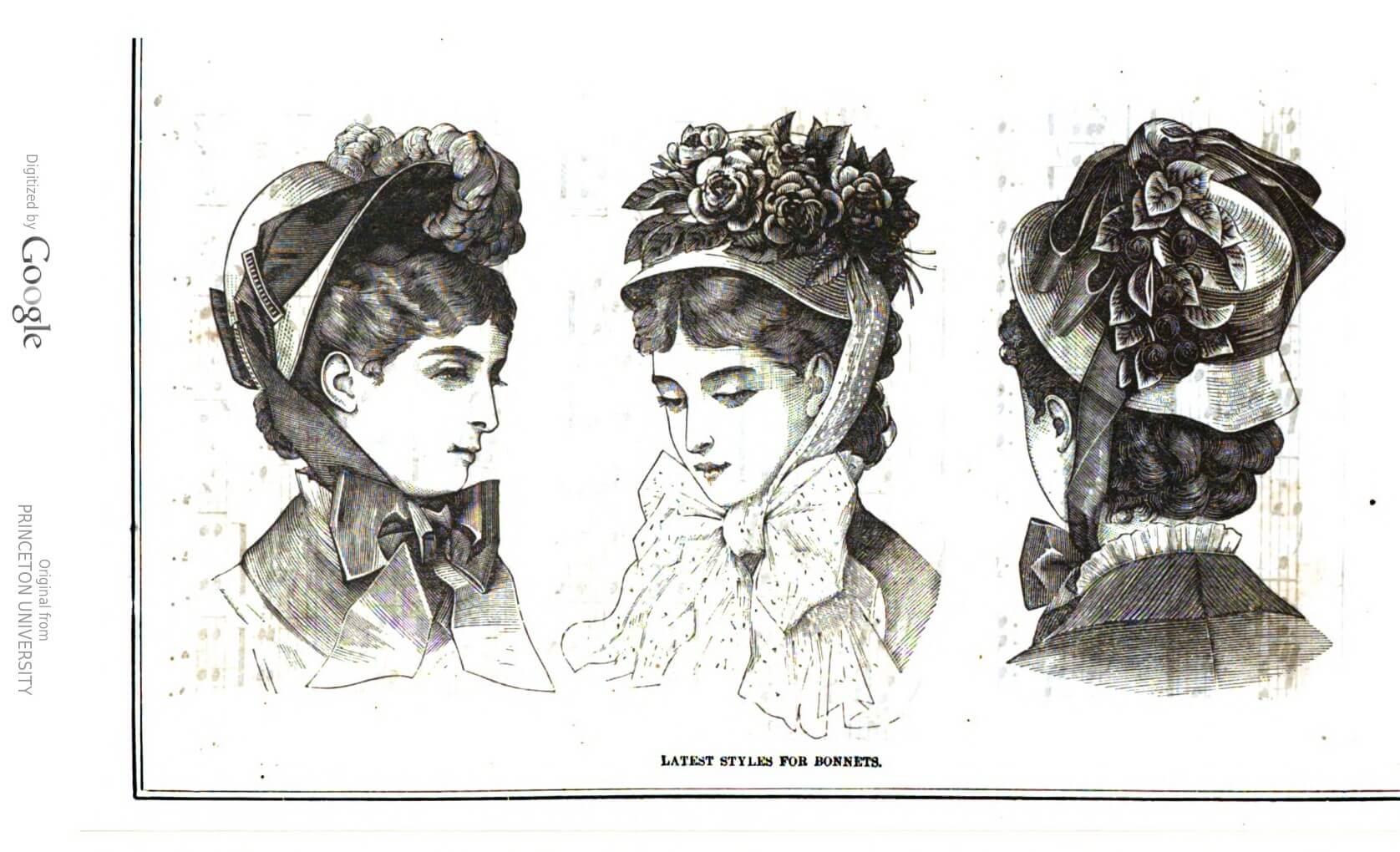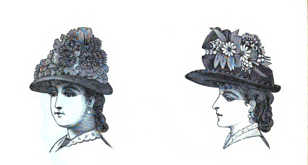 “Latest styles for bonnets” from Peterson’s Magazine, May 1880.