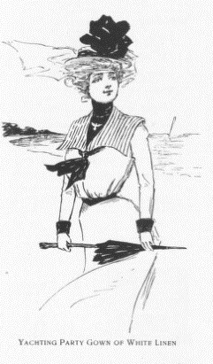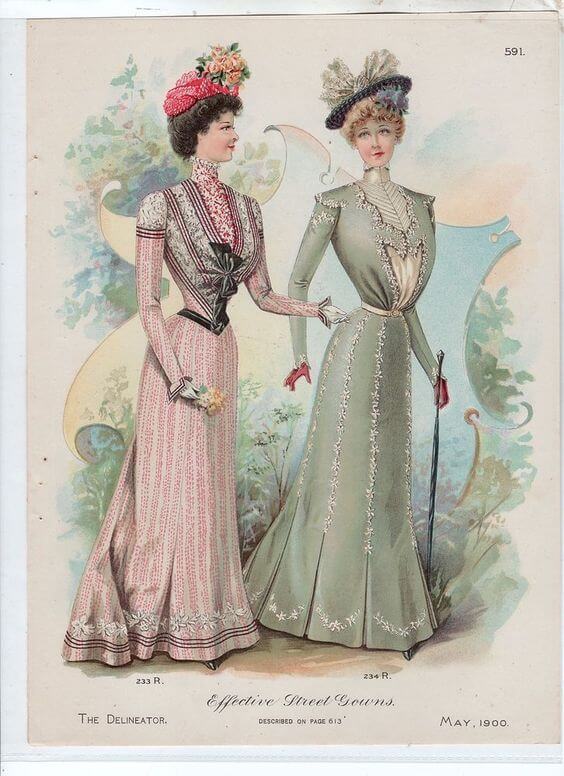 1900The new century ushered in changes of all kinds, but the fashionable silhouette remained largely unchanged from the previous decade. The S-shape dominated and corsets pushed the bust forward and hips back, emphasizing a narrow waist and large monobosom as seen in the illustration below.
