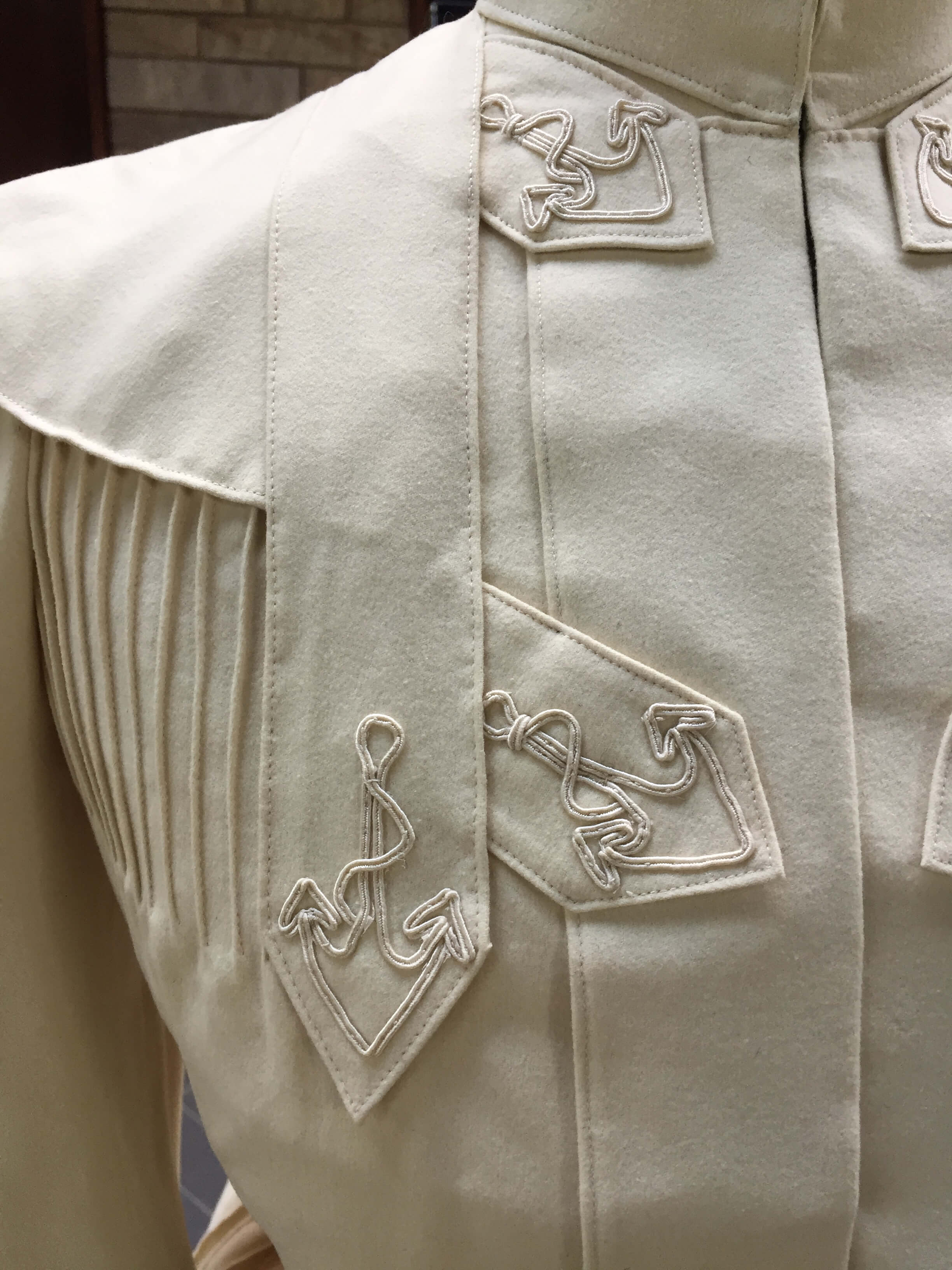 Fashion aficionados in 1880 would have approved of the rich red color. Though we associate pastel colors with springtime, Godey’s Lady’s Magazine favored dark colors for the spring of 1880: “Dark marine blues, brownish reds, dark dull greens, and reddish purples are the most fashionable tints.”Jackets and cloaks were essential garments for women venturing outdoors to pay calls, go shopping, or run errands on chilly spring days. The bustle silhouette was best suited for cropped jackets and snug coats, but cloaks like the visite worn by Adelaide Frick remained popular and could be cut to accommodate a high bustle in the back. The mantle or dolman cut featured wide, draping sleeves, often cut in one piece with the body. The bold paisley pattern, Asian styling, velvet color, and exuberant fringe make a dramatic fashion statement.