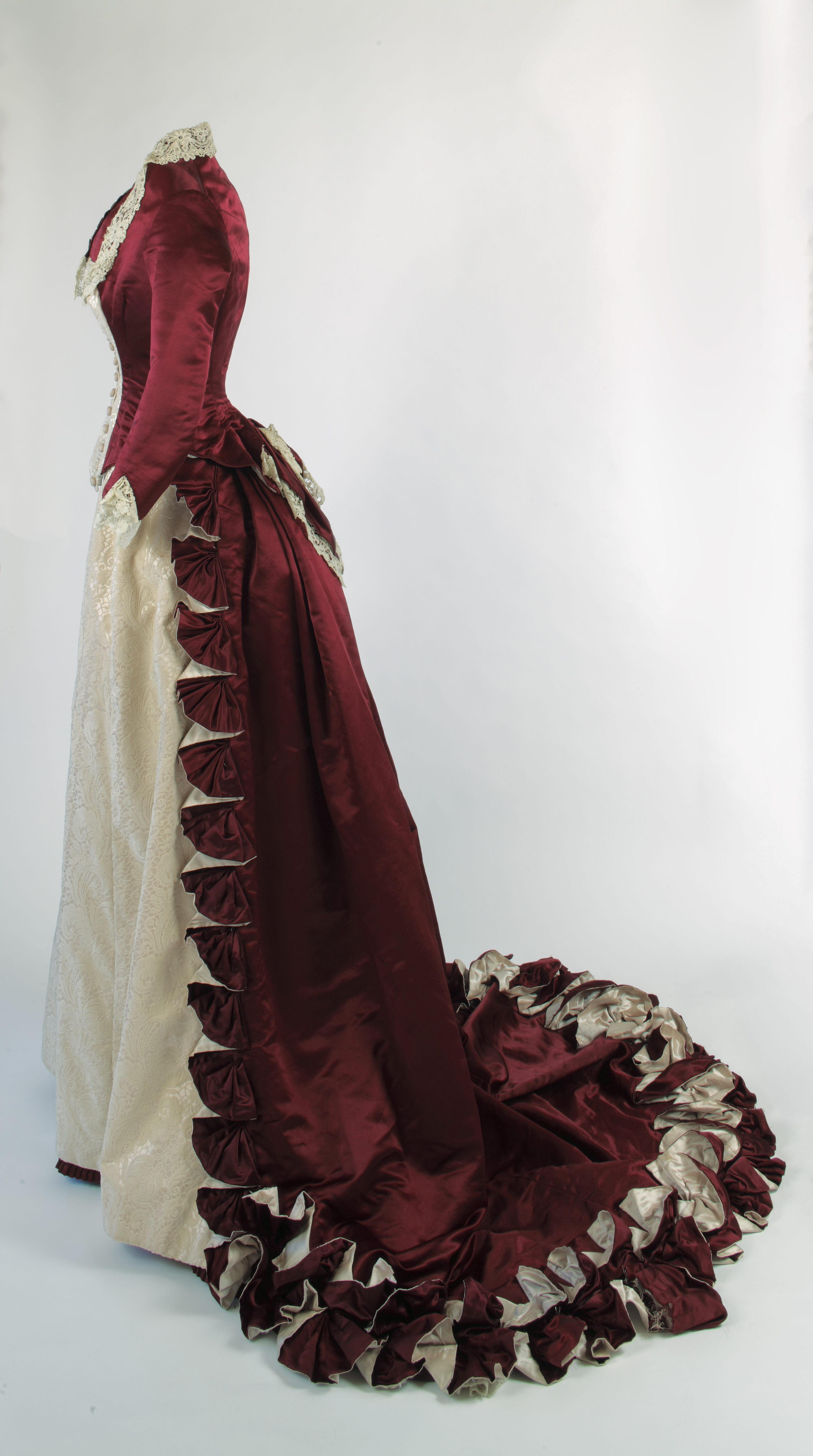 The fashionable silhouette of 1880 was rather structured. Bodices were form-fitting with high, narrow-cut shoulders and tight sleeves, and were often cut in a “princess line” with no horizontal seam at the waist. The bustle of the previous decade had returned, this time with a high, rigid, shelf-like protrusion at the rear that concentrated the voluminous skirts behind the wearer.