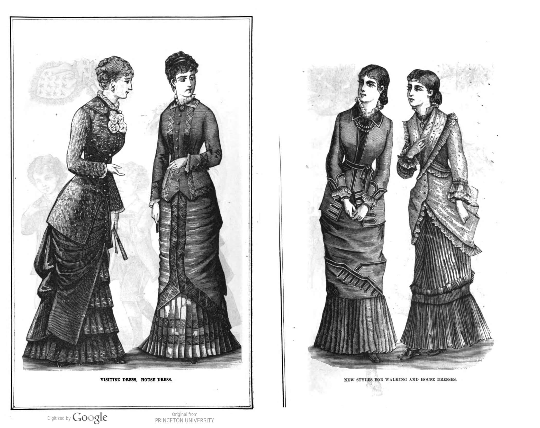 Left: “Visiting dress, house dress” from Peterson’s Magazine, April 1880. Right: “New styles for walking and house dresses” from Peterson’s Magazine, May 1880.