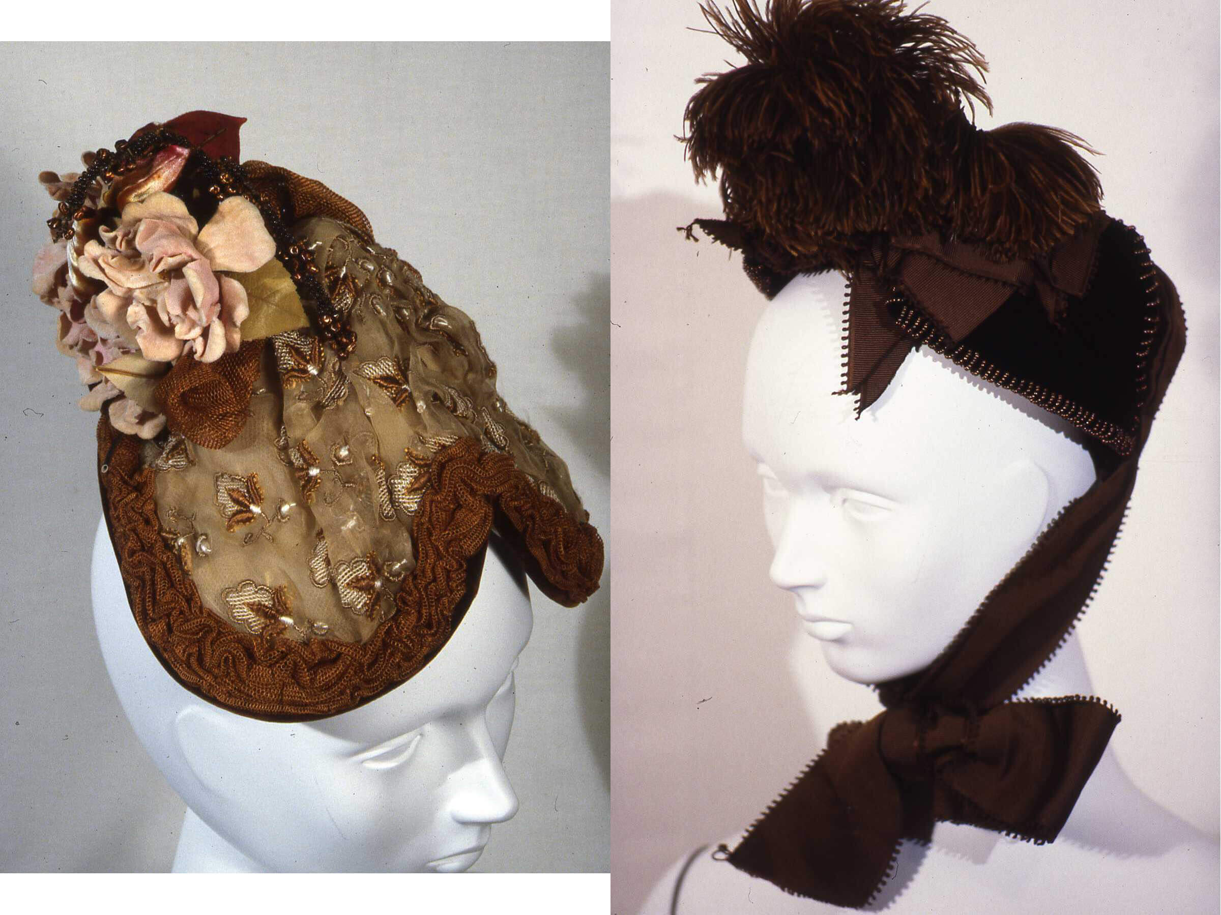 Left: Unknown maker. Hat, c. 1880. Silk, embroidery, artificial flowers, and beading. Right: Mme. J.M. Cary Pardee (New York). Hat, c. 1885. Silk, taffeta, beading, and feathers. The Frick PIttsburgh.