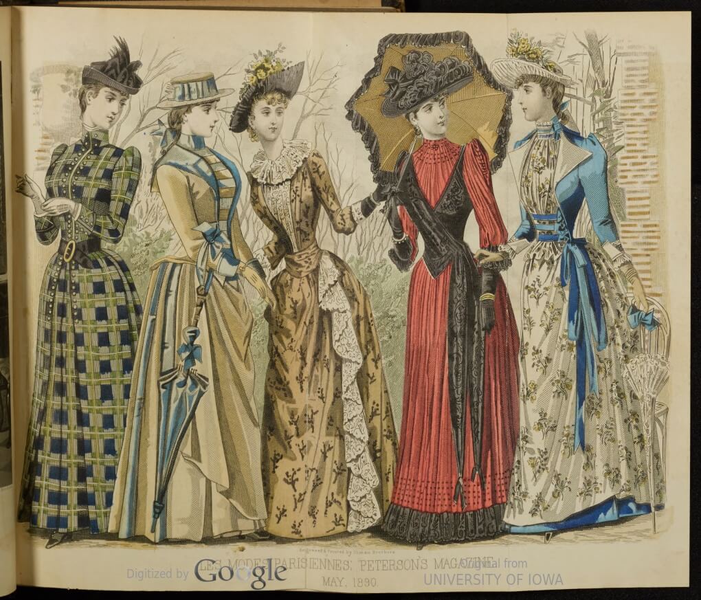 1890The 1890s were a period of transition as the stiff and proper Victorian era gave way to the freedoms of a new century. By 1890, the bustle was on its way out and skirts were bell-shaped, skimming over the hips and flaring at the bottom. Sleeves were full, starting with a small puff at the shoulder seam and growing to the endearingly named “leg of mutton” sleeve by the middle of the decade—see the 1896 image of Adelaide for one example. [Side note: Puff sleeves are making a comeback! They are projected to be one of the major spring 2020 fashion trends.]